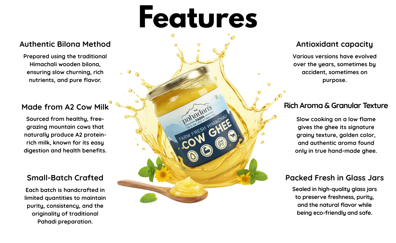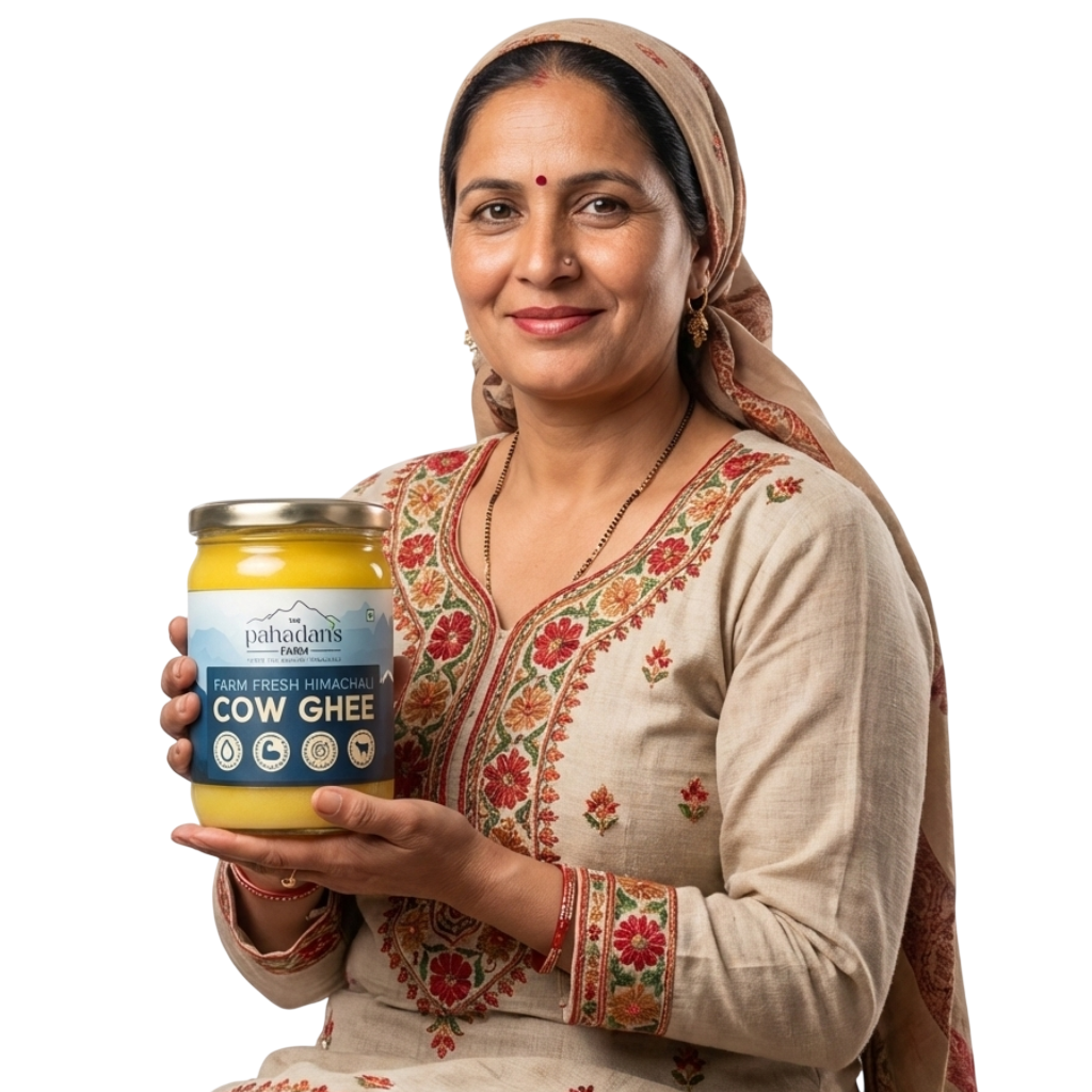 Hand-churned from A2 cow milk using the traditional bilona method, straight from the hills of Himachal Pradesh.